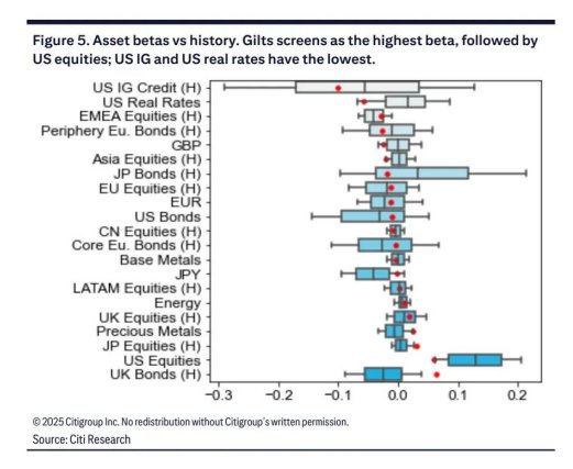 花旗分析师指出,由于即将实施的关税影响存在不确定性,各资产类别存在较多分歧。总体而言,资产管理公司仍超配股票,并在近期开始增持债券以对冲关税风险。报告还强调,英国国债和美国股票是目前贝塔值最高的资产,而美国投资级债券和实际利率产品的贝塔值则处于历史低位。