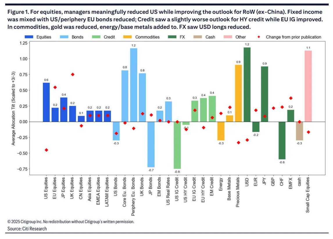 报告显示,管理着超过20万亿美元资产的15家大型机构近期减少了对美国股票和小盘股的配置,转而增持欧洲、英国及新兴市场(除中国外)的股票。美国债券的配置也略有下降,但利率观点整体变化不大。
